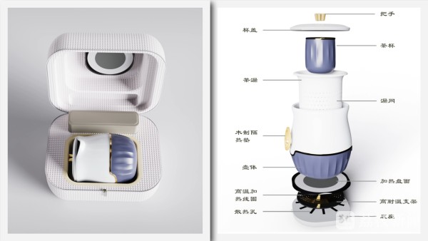 产品艺术设计专业学生参展作品,主要以“路演PPT”形式呈现。学院产品艺术设计专业学生杭振的参展作品是“便携式商务养生茶具”。“我设计这套茶具整体非常紧凑,茶杯、茶壶、加热底座、储药盒,都可以放在一个腰包大小的收纳盒当中,很适合商务人士出差使用。”