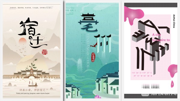 同专业学生刘晓晓说:“我设计的作品是以蚌埠市的地标——中国南北分界线标志为主要元素,进行了几何抽象化设计。另外蚌埠也是珍珠之乡,有珠城的美名,我在海报上加珍珠作为点缀。”