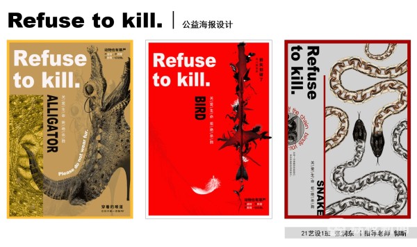 学院艺术设计专业学生张润说:“我的作品主题是‘拒绝杀戮’,我选择了人类杀戮动物的三种典型案例,包括皮革、野味和猎奇,通过这组动态海报我想传达的是人类要善待动物、保护自然。”