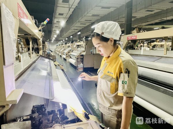 走进江苏德顺纺织有限公司的织造一车间,纺织女工侍文雅正穿梭于纺织机之间,检查机器的运行情况。手举强光手电筒,娇小的身影来回不停地走动,专注的目光探寻着布面上的点点滴滴,一丝一毫的异常都逃不过她经验老道的双眼。