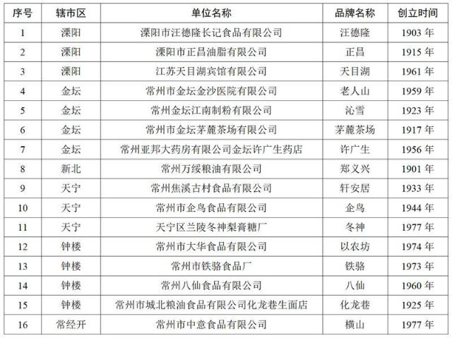 常州市自2011年开始“常州老字号”认定工作,迄今已完成四批,本次共认定16家企业(品牌),既有龙城百姓耳熟能详的“老字号”,如化龙巷生面店、企鸟食品、汪德隆、许广生药店等,也有一些拥有独特技艺或产品,如天目湖鱼头、横山肉松、老人山骨科等。