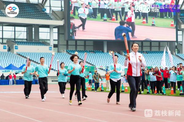 第四届江苏省中老年趣味运动会的开幕式可谓诚意满满,不仅有击剑项目奥运冠军获得者许安琪与江苏广播多位主持人共同传递火炬,还有花棍、轮滑、健步操等由老年朋友带来的开幕式表演,以及千人柔力球表演《美丽中国》。
