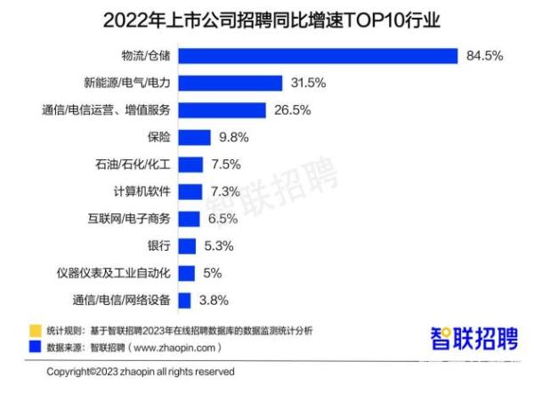从增长情况看,2022年上市公司招聘同比增速前10行业中,物流/仓储、新能源/电气/电力行业表现最为亮眼,招聘职位数同比增速分别达84.5%、31.5%。网购成为消费者购物的重要方式,从而带动物流业务量大幅增长,物流上市公司的招聘需求也呈现快速增长态势。其次,受“双碳”政策驱动,清洁生产改造、清洁能源替代正在制造业、工程建筑业等多领域推行,新能源行业上市公司的招聘需求也得以快速上升。