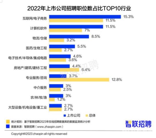 从行业看,2022年上市公司招聘规模前五的行业分别为:互联网/电子商务、计算机软件、物流/仓储、医药/生物工程、电子技术/半导体/集成电路,招聘规模在上市公司招聘总量中分别占15.3%、11.5%、8.5%、5.5%、4.6%,分别比这些行业在全国招聘总量的占比高出3.8个、4.5个、5.3个、2.8个、1个百分点。这些行业多为技术密集行业,上市公司之间的竞争尤其体现在人才的竞争,需要持续通过引进人才扩大业务发展, 因而整体招聘需求旺盛。