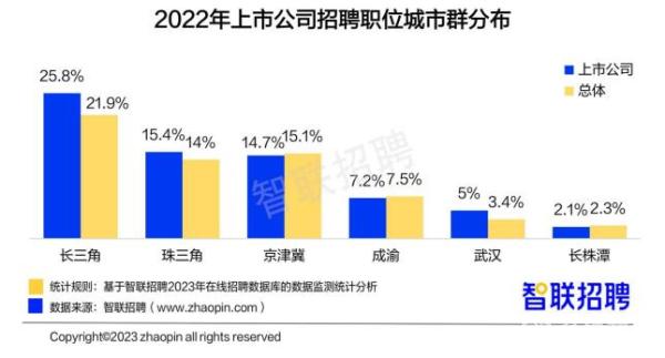 长三角城市群是上市公司职位集聚的主要区域,2022年,25.8%的上市公司招聘职位汇聚长三角,高于全国总体21.9%的水平。同时,15.4%的上市公司招聘位于珠三角城市群,高于全国总体的14%。由于长三角城市群、珠三角城市群汇聚了众多经济发达城市,上市公司总部多集聚于此,因此招聘职位数量也在各城市群中排名领先。此外,京津冀城市群也汇集了14.7%的上市公司招聘职位。