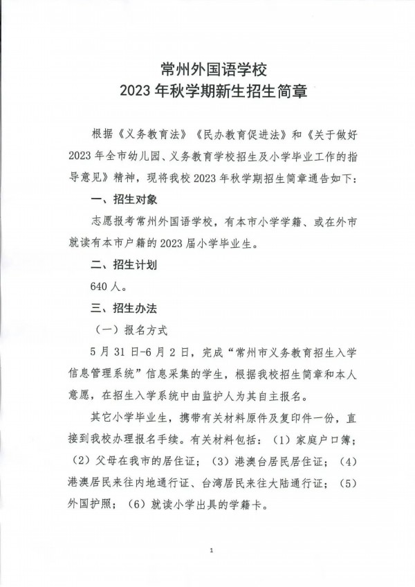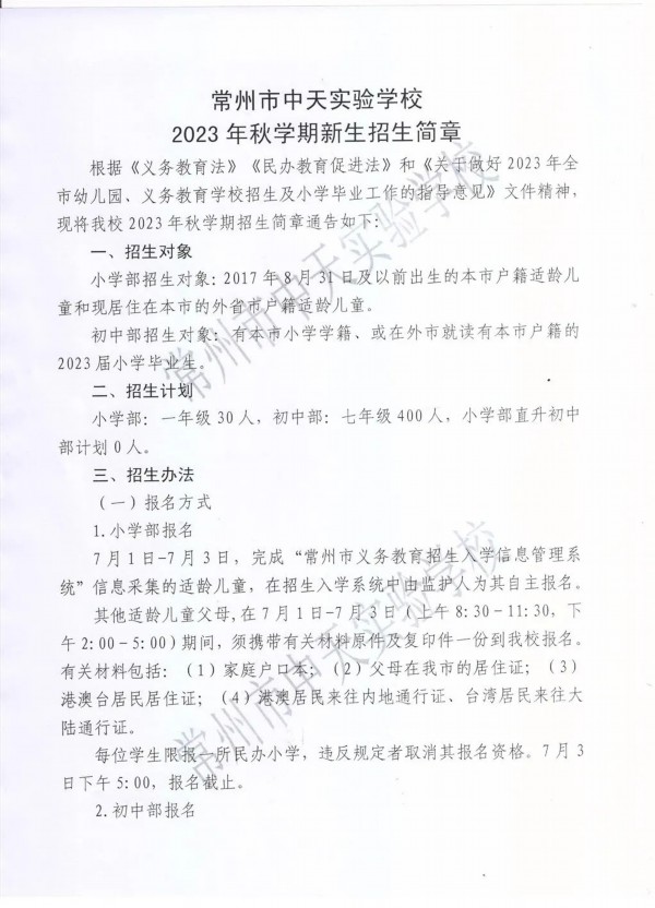 根据《义务教育法》《民办教育促进法》和《关于做好2023年全市幼儿园、义务教育学校招生及小学毕业工作的指导意见》(常教发[2023]2号)精神,现将我校2023年秋学期招生简章通告如下: