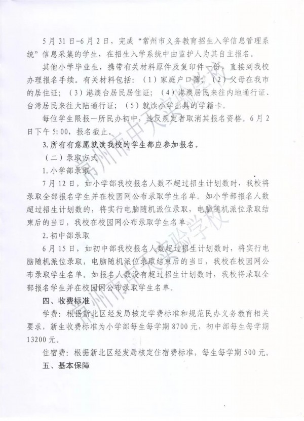 1.5月31日-6月2日,在常州市义务教育招生入学信息管理系统(简称“招生入学系统”)完成信息采集的应届小学毕业生,根据我校招生简章和本人意愿,在招生入学系统中由监护人为其自主报名。其他无法通过系统报名的应届小学毕业生在5月31日-6月2日(上午8:00-11:00,下午1:30-4:30)期间,带好有关材料的原件和复印件(一份)到校办理报名手续,有关材料包括:(1)家庭户口簿、或者父母在我市的居住证、或者港澳台居民居住证、或者外国护照;(2)就读小学出具的学籍卡。