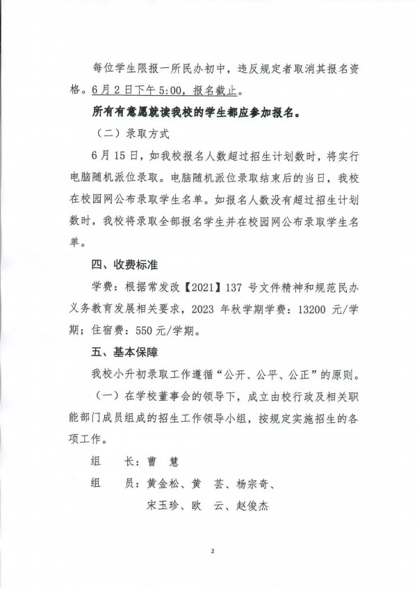 2.所有有意愿就读我校的学生都应参加报名,每位学生限报一所民办初中,违反规定者取消其报名资格。6月2日下午5:00报名截至。