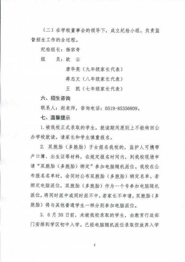 (二)在学校理事会的领导下,成立纪检小组,负责监督招生工作的全过程。