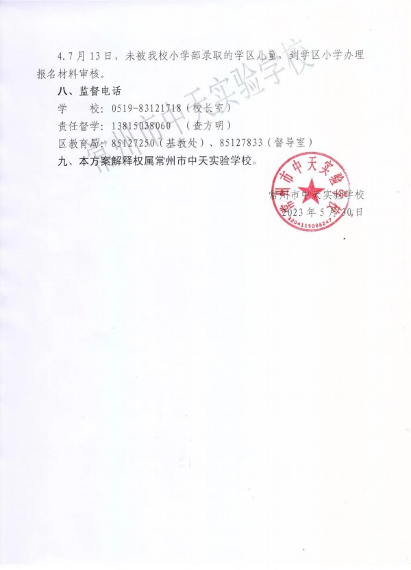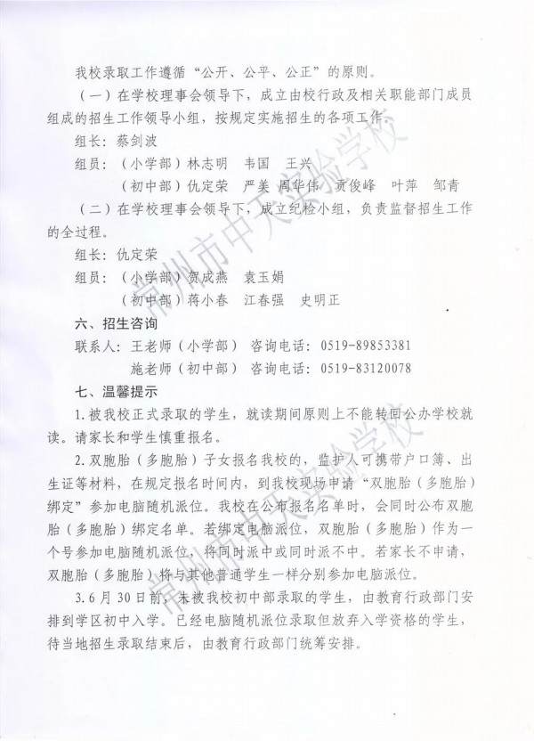 3.6月30日前,未被我校初中部录取的学生,由教育行政部门安排到学区初中入学。已经电脑随机派位录取但放弃入学资格的学生,待当地招生录取结束后,由教育行政部门统筹安排。