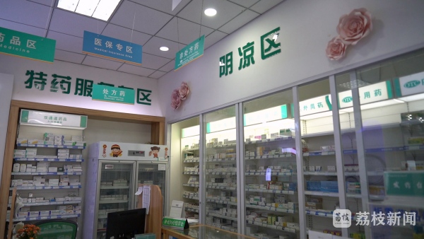 在江苏省医药有限公司国药商场,有一片特殊的双通道药品专区,专区内大概陈列了190多种双通道药品,其中主要是一些抗肿瘤以及罕见病用药。由于这些药品大多都对储存条件有着特殊要求,因此专区分为常温区、阴凉区和冷藏区。除了一个药品冷藏柜以外,在药店后方还有专门建立的冷库,常年保持着2到8℃的低温,用来保证冷藏链药品的安全。