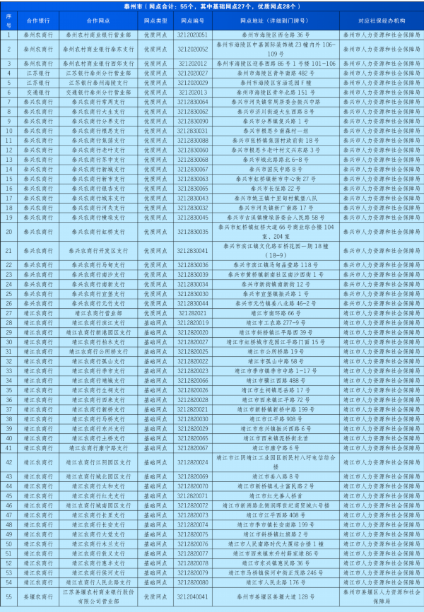 近日,省人力资源社会保障厅办公室发布《关于公布社保经办业务“就近办”银行合作网点验收通过名单(第一批)的通知》,泰州市6家银行的28个优质网点、27个基础网点顺利通过验收,优质网点数量全省第一。