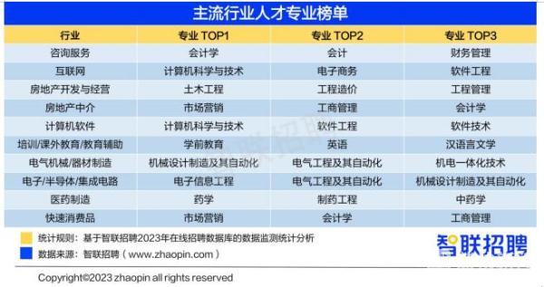 2023年高考已经落下帷幕,填报志愿环节即将到来。今天智联招聘发布《大学生就业前景研判及高考志愿填报攻略》(简称《攻略》),汇总主流行业人才专业榜、高潜力行业人才专业榜、高增速职业人才专业榜、热门投递职业人才专业榜等榜单,为考生们提供参考。