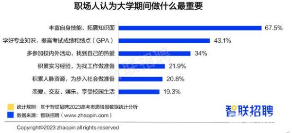 并不是每一位考生都能如愿进入自己最理想的院校或者专业,有些学生可能进入自己的“备选”专业,或者“服从调剂”。对此,北京大学国家发展研究院经济学教授李力行表示,学生可多发掘第二学位、转专业、辅修、跨校修课等机会,同时随着对“备选”专业的学习,也可能认识到这些专业的魅力所在。此外,他还建议准大学生除了专业知识的学习,应当在大学期间体验丰富多彩的校园生活,锻炼自己的社交能力,培养自己的审美能力等。智联招聘调研数据表明,67.5%的职场人认为大学期间最应当“丰富自身技能、拓展知识面”,此外, 36.4%的职场人都有“辅修第二专业”的经历,也有18%的职场人“既辅修第二专业又跨专业考研”。对于多学一个专业带来的好处,54.9%的职场人认为可以“学习到更多知识和技能,成为复合型人才”,占比最高。39.8%认为能“避免虚度时间,校园生活更丰富充实”,26.9%表示“招聘方认可度高,找工作时更有竞争力”。可见,多学一个专业对于职场人而言,从修身到求职都十分受益。
