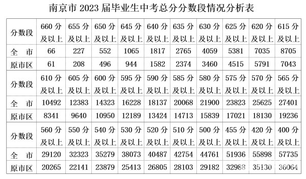 上表中的分数包括7门文化科目考试成绩(含英语听力口语考试成绩)、体育考试成绩和政策性照顾加分。浦口区、江宁区、六合区、溧水区、高淳区的分数段情况,由区考试中心(招考办)向本区考生公布。