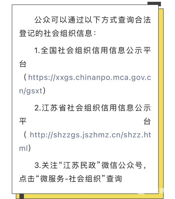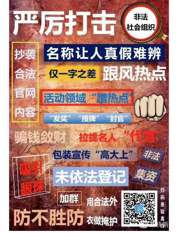 非法社会组织是指未经民政部门登记,擅自以社会组织(包括社会团体、基金会、社会服务机构)名义开展活动的组织,或者是被撤销登记后继续以社会组织名义活动的组织。当前,非法社会组织隐蔽性、欺骗性、迷惑性越来越大,公众可以通过全国社会组织信用信息公示平台(https://xxgs.chinanpo.mca.gov.cn/gsxt)或江苏省社会组织信用信息公示平台(http://shzzgs.jszhmz.cn/shzz.html)查询合法登记的社会组织信息,提高甄别能力。