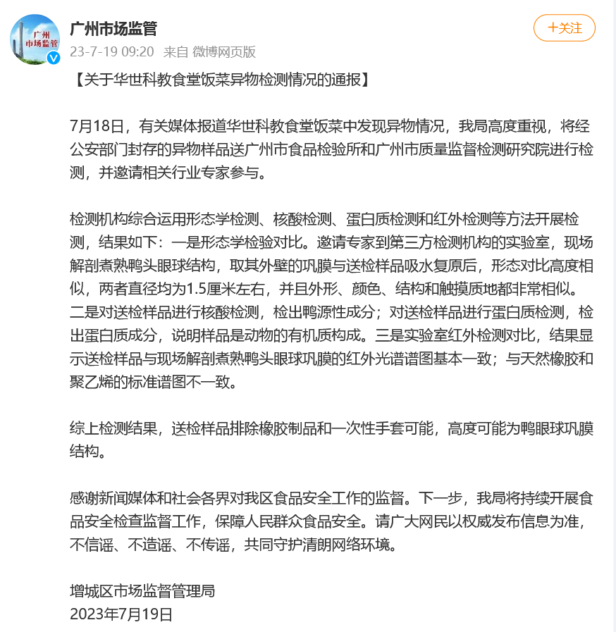 荔枝新闻讯 @广州增城发布 19日消息,增城区市场监督管理局发布《关于华世科教食堂饭菜异物检测情况的通报》: