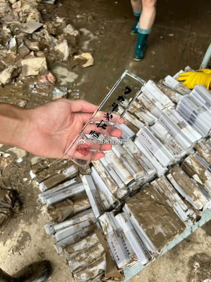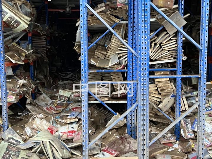 因为淤泥太多,一整个仓库的书也没什么能“抢救”的了,全都要报废,所以就直接上叉车了。