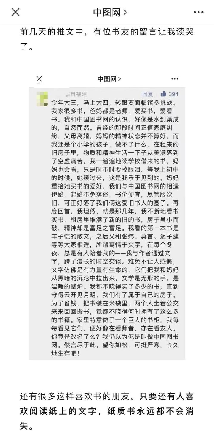 8月11日,中图网还发起了“你认为纸质书会消失吗”的讨论,无数网友留下有关“纸质书”的故事,触动人心。