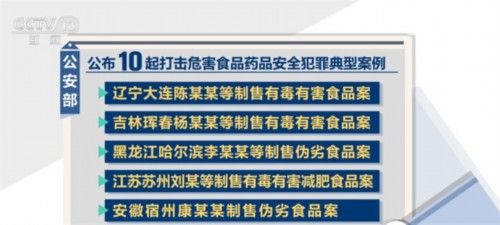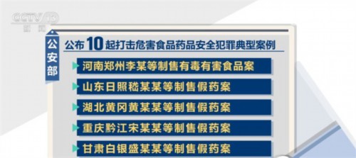 当天,公安部还公布了10起打击危害食品药品安全犯罪典型案例,涵盖农产品、水产品、肉制品、减肥产品、保健食品等食品领域,以及治疗风湿、腰腿疼痛、哮喘等老年人常见疾病药品领域,具有一定的典型性、代表性。案件中有的非法添加化学药物,有的滥用食品添加剂,有的添加化学药成分冒充所谓“纯中药”,犯罪手法隐蔽、性质恶劣,给人民群众身体健康带来严重威胁。