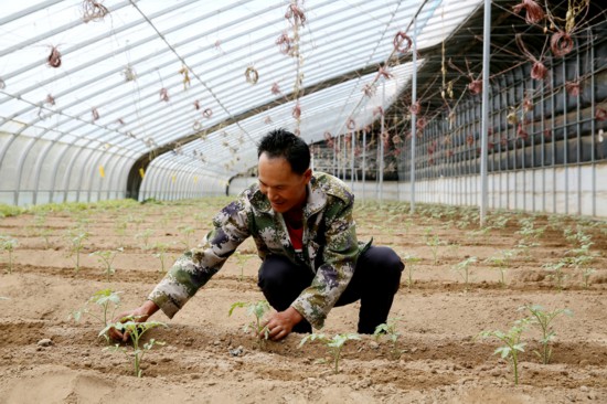 安兴民在大棚内查看西红柿的长势。王燕摄