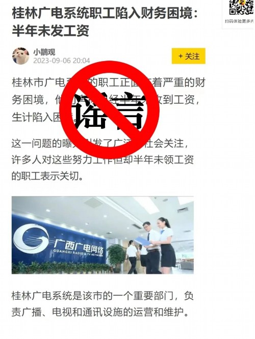 荔枝新闻讯 9月7日,桂林市互联网信息办公室发布《关于网传桂林广电系统职工陷入财务困境,半年未发工资的辟谣》:近日,网络传播一则声称桂林广电系统职工陷入财务困境,半年未发工资的信息,经核查,此信息失实。请大家不信谣不传谣。我办保留追究编发失实信息人员法律责任的权利。