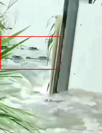 视频画面显示,洪水冲上路面,路面指示牌显示前往茂名方向,水中被圈出几处红圈。视频配文称:接通知,彭村塘环湖路旁出现鳄鱼,为附近养殖场逃出的鳄鱼,请村民代表通知附近村民远离水面,禁止下水捕鱼,有特殊情况及时汇报。