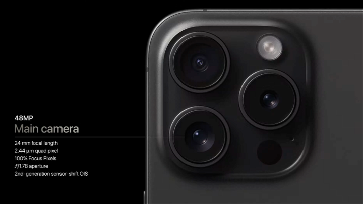 iPhone 15 Pro系列仍然配备后置4800万主摄、24 毫米焦距,ƒ/1.78 光圈,1200万超广角镜头,以及1200万长焦镜头。