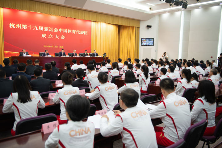 9月12日,杭州第19届亚运会中国体育代表团成立大会现场。新华社记者 陈钟昊 摄