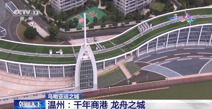 总台记者梁烨:温州龙舟运动中心是全亚洲最高标准的龙舟赛场。从空中俯瞰,整栋楼看起来非常狭长,并且高低起伏犹如山脉,就好像是一条龙静卧在水面之上,因此,这幢楼也被称为龙楼。比赛时,这里主要作赛事保障用途。紧挨着龙楼的建筑,从正面看像是船桨,从侧面看像龙舟的建筑,就叫舟塔,这也是比赛的终点塔。比赛期间,裁判员们就会在这里观看比赛,在这里计时计分。