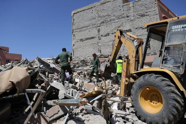 9月11日,救援人员在摩洛哥马拉喀什南部的艾米兹米兹村地震废墟上搜救。新华社记者王东震摄