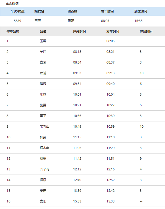 5640/5639次列车开行于贵阳和玉屏之间,中间途经大大小小14个站——羊坪、青溪、蕉溪、镇远、水花、施秉、黄平、宝老山、加劳、桐木寨、凯里、六个鸡、福泉、贵定。
