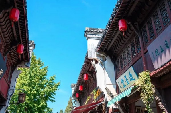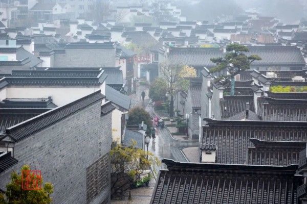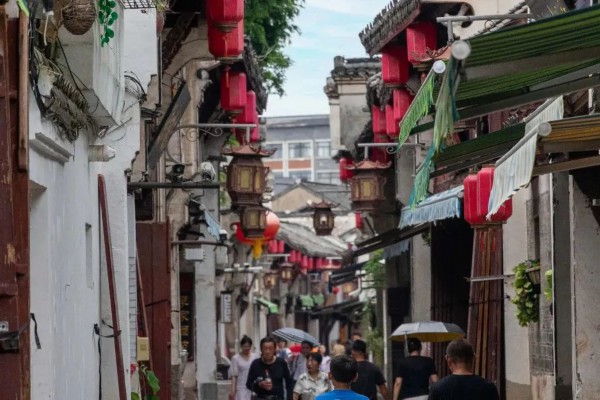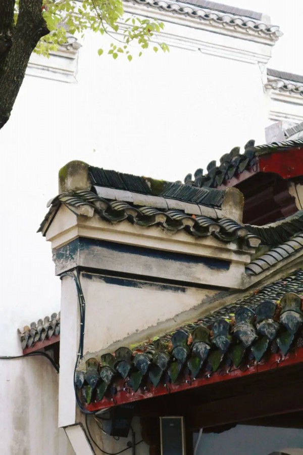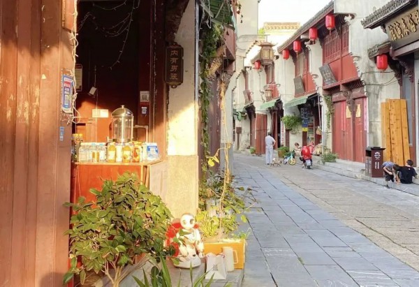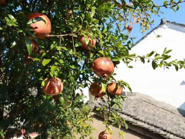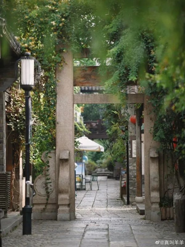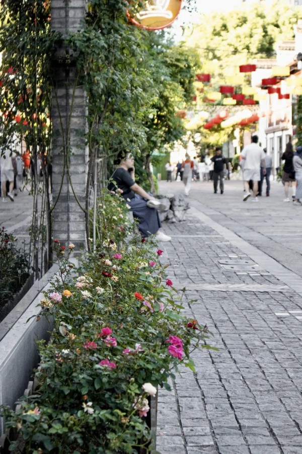 古朴街巷间白墙黑瓦映衬着绿叶红花