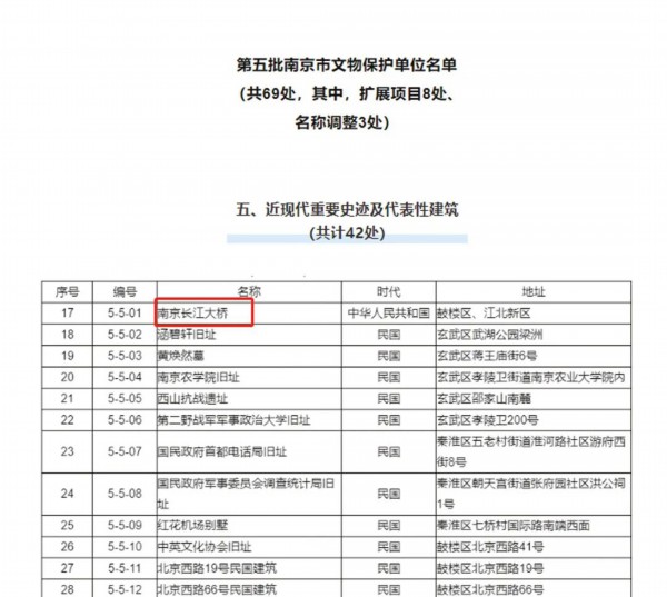 9月20日,记者从南京市政府办公厅近日印发的《市政府关于公布第五批市级文物保护单位的通知》获悉,南京长江大桥作为近现代重要史迹及代表性建筑,被列入第五批市级文物保护单位。