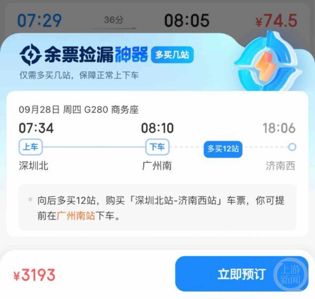 在苏女士这条帖子的评论区,很多网友也晒出了自己类似的遭遇。一位网友的图片显示,他本打算买28日早上深圳北到广州南的高铁商务座车票,但显示无票。系统推荐他“向后多买12站,购买深圳北站-济南西站车票,你可以提前在广州南站下车。”数据显示,他需要支付3193元,这位网友戏称,“要不我把整个高铁包下来得了!”