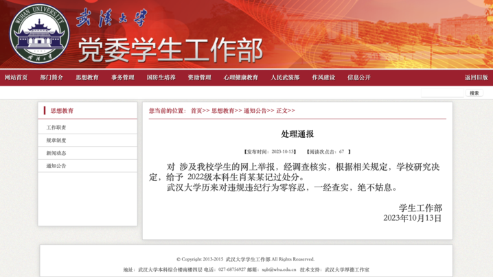 荔枝新闻讯 据武汉大学学生工作部官网消息,对涉及我校学生的网上举报,经调查核实,根据相关规定,学校研究决定,给予2022级本科生肖某某记过处分。