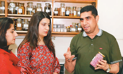 在巴基斯坦伊斯兰堡真纳大学,穆什塔克·艾哈迈德教授(右一)向学生们展示中医药用植物。 |