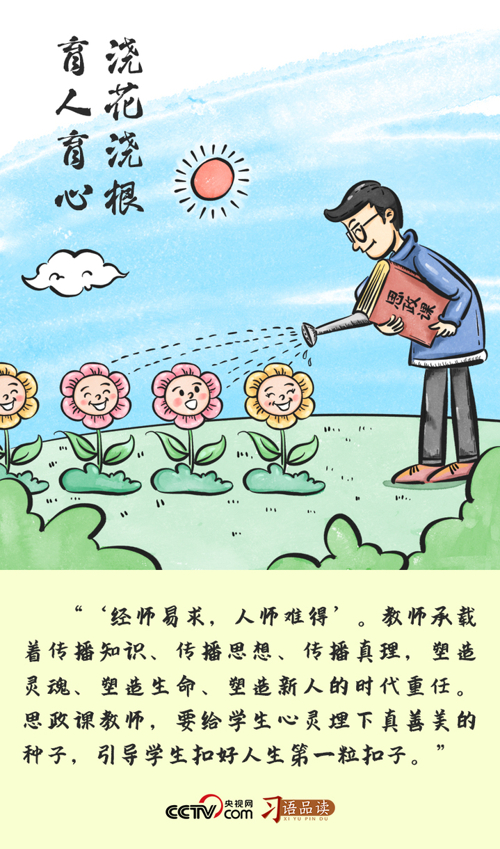 浇花浇根,育人育心。思政课教师就像园丁,在学生心灵这方沃土上,播撒求真、向善、尚美的种子。求真就是要追求真理,学会“真”知识、掌握“真”本领;向善是指要明德守矩,见贤思齐;尚美是指涵养“天下大同,美美与共”的思想境界,建立健康美好的价值观。