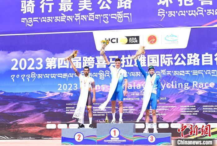 10月14日,第一赛段(林芝)前三名站上领奖台。中新社记者 赵朗 摄
