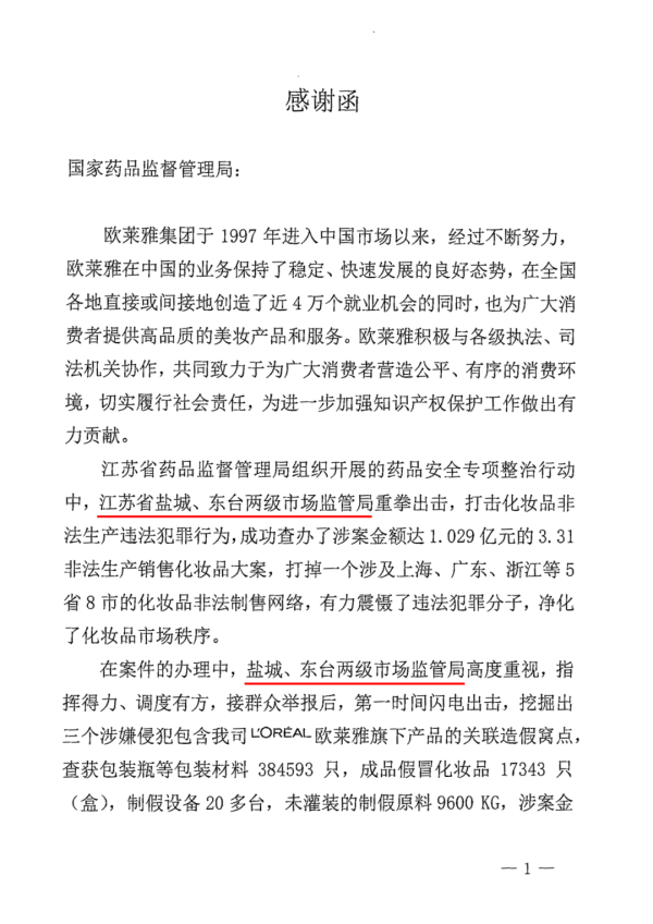 欧莱雅(中国)有限公司致《感谢函》对市场监管部门秉公执法、高效打击侵权行为、切实维护企业合法权益表达了诚挚感谢。