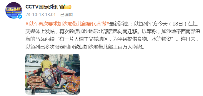 以色列军方今天(18日)在社交媒体上发帖,再次敦促加沙地带北部居民向南迁移。以军称,加沙地带西南部沿海的马瓦西镇“有一片人道主义援助区,为平民提供食物、水等物资”。连日来,以色列已多次限定时间敦促加沙地带北部上百万人南撤。