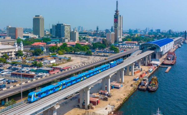 这是尼日利亚拉各斯轻轨蓝线上的一列轻轨列车(2022年12月21日摄,无人机照片)。新华社发(托普·阿尤库摄)