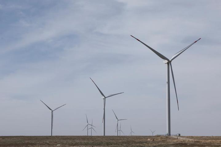 这是4月3日在哈萨克斯坦札纳塔斯拍摄的札纳塔斯100兆瓦风电项目风机。新华社发(奥斯帕诺夫摄)