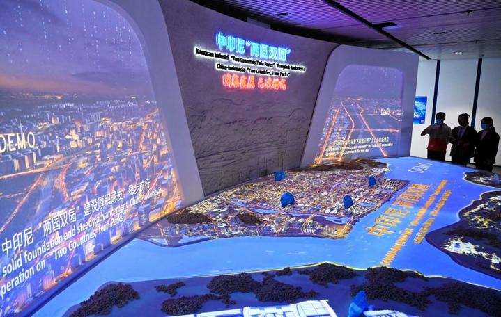 这是2022年11月16日拍摄的福州元洪投资区元洪食品数字经济产业中心的中印尼“两国双园”沙盘和项目介绍。中印尼“两国双园”是以福建福州元洪投资区和印尼的民丹工业园等园区为载体,探索建立产业互联、设施互通、政策互惠的双园结对合作机制。新华社记者林善传摄