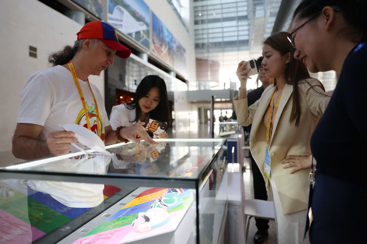 10月16日,参会记者在“一带一路”国际合作高峰论坛新闻中心参观展示的中国非物质文化遗产展品。新华社记者 陈斌 摄