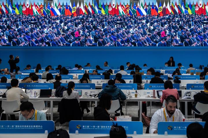 △2023年10月18日,北京,第三届“一带一路”国际合作高峰论坛新闻中心,记者在采访开幕式。