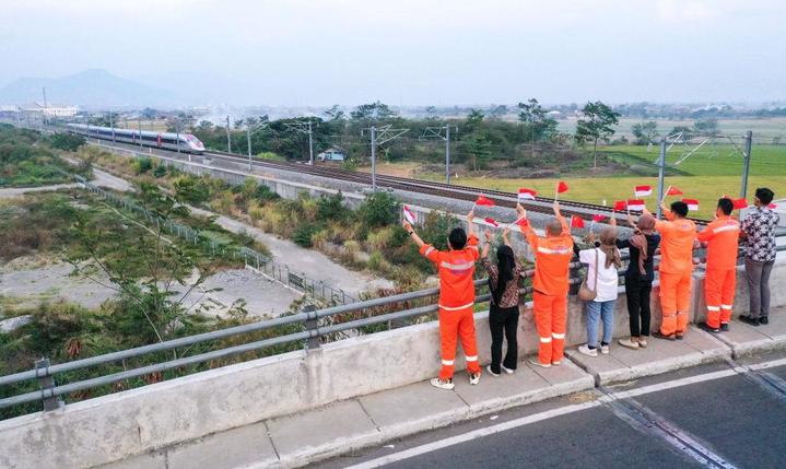 △2023年10月17日,在印度尼西亚万隆一座天桥上,雅万高铁中国建设者和印尼籍员工挥舞着中国和印尼两国国旗,向远处驶来的一列雅万高铁高速动车组列车欢呼。