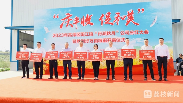 自丹湖秋月品牌运营公司成立以来,吸纳了一批种养大户和农业主体参与生产经营,产品销售稳步增长,集体经济逐步壮大,品牌效应初步显现。截至目前,丹湖秋月运营公司销售额累计达1280余万元,实现股东分红220余万元。活动现场,来自阳江镇的9个特色村分别获得了“丹湖秋月”公司发放的10万至39.5万不等的分红。