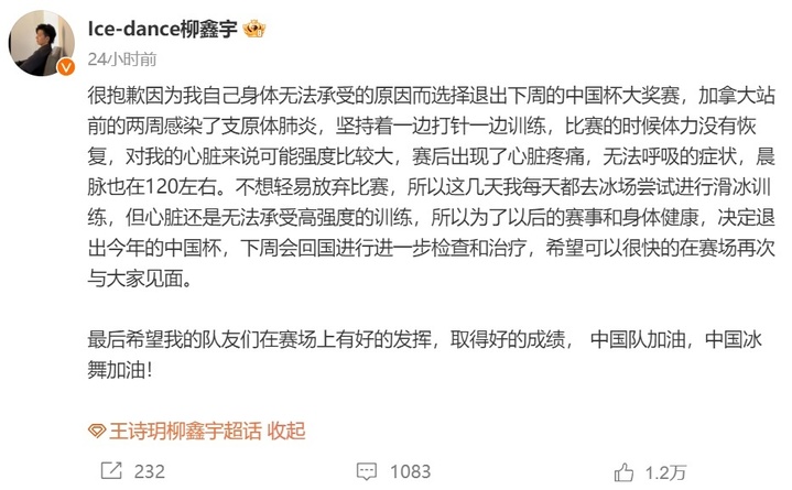 11月4日,中国花样滑冰冰上舞蹈运动员柳鑫宇发博:因感染了支原体肺炎,身体还未完全康复,将退出下周的中国杯大奖赛。下周会回国进行进一步检查和治疗,希望可以很快的在赛场再次与大家见面。