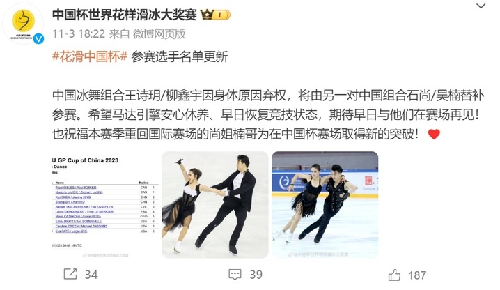 此前,@中国杯世界花样滑冰大奖赛 官方也公布了中国冰舞组合王诗玥/柳鑫宇因身体原因弃权,将由另一对中国组合石尚/吴楠替补参赛。
